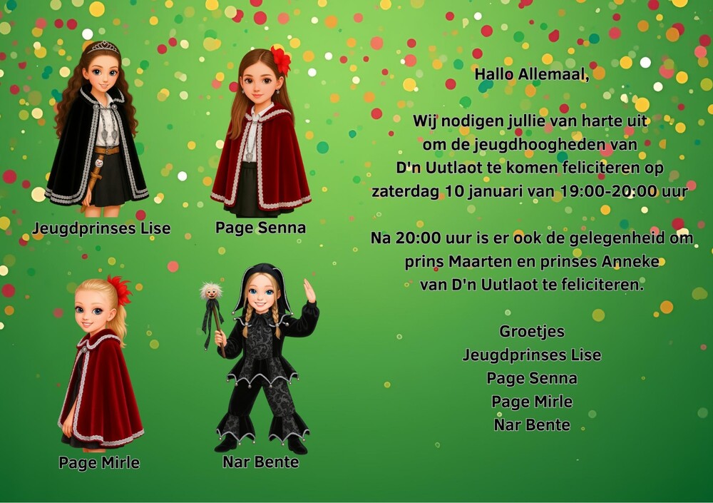 Van 19:00 uur tot 20:00 uur heb je de mogelijkheid om Jeugdprinses Lise met haar gevolg te feliciteren.